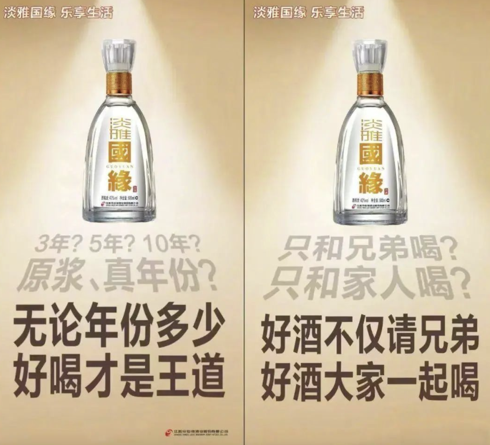 网络流传出两张标注着“江苏今世缘酒业股份有限公司”字样的海报,引发圈内热议——一张海报印有“3年?5年?10年?原浆、真年份?无论年份多少好喝才是王道”,另一张则显示“只和兄弟喝?只和家人喝?好酒不仅请兄弟,好酒大家一起喝”字样。